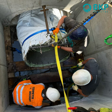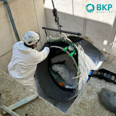 Berliner Wasserbetriebe was impressed by the preparations, the creation of a risk matrix and the diverse project experiences of its partners. After the extensive preparatory work by Stehmeyer + Bischoff, the heavy liners were easily pulled in using the BKP conveyor belt including a folding device. David Kijewski and Olaf Meier, BKP application engineers, helped the “SteBi” crew in handling such a large and heavy liner. “The team carried out the job with great routine within a very short period of time,” says David Kijewski.